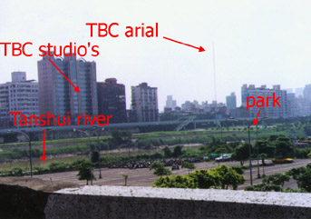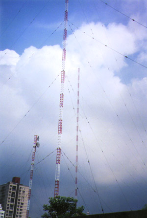 | This is a photo of the Taiwan Broadcasting Corporation's aerial mast next to the Hsin Tian river (wrote it wrong on the photo) on the edge of Taipei City. Two 10 kW transmitters feed in this mast, but the engineer told me actual power is only 9 kW per transmitter. Frequencies are 1188 kHz and 1323 kHz. | ![]() |